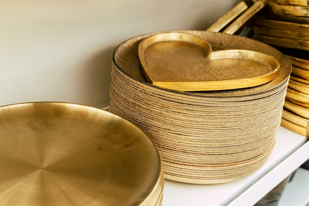 Ob rund oder in Herzform – diese goldenen Teller machen aus jeder Oberfläche ein dekoratives Highlight.