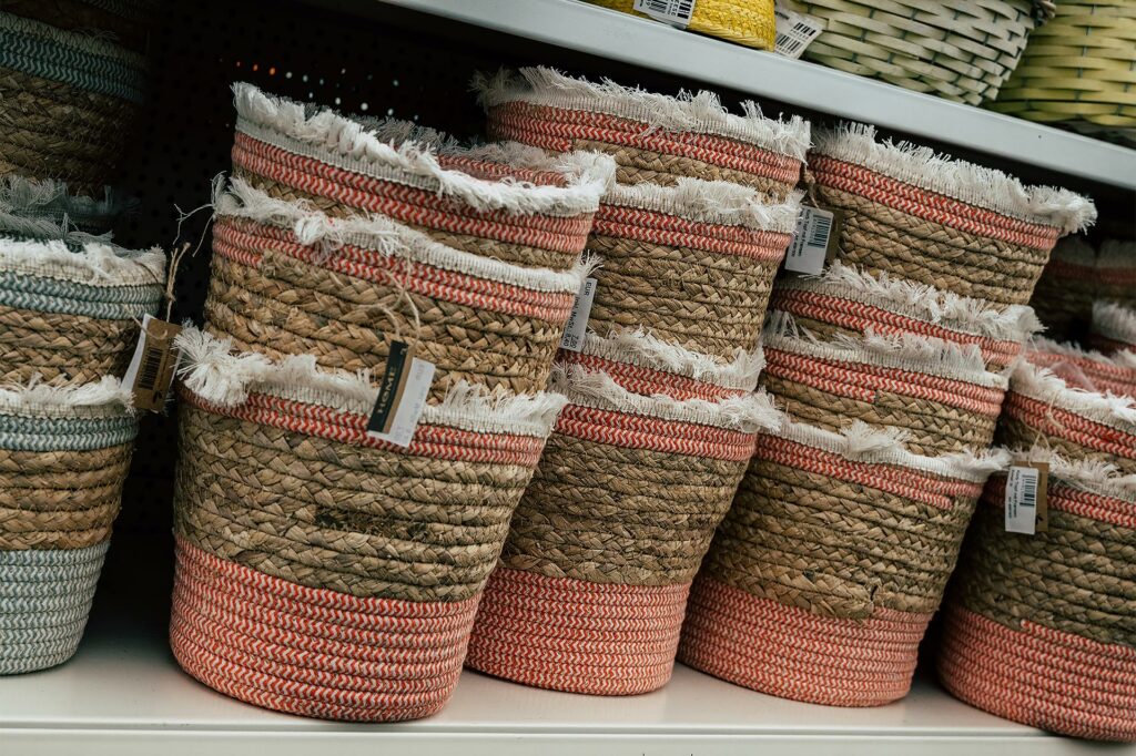 Praktisch und dekorativ zugleich: Diese geflochtenen Körbe mit Stoffrand sind ideal für Pflanzen, Decken oder Krimskrams.