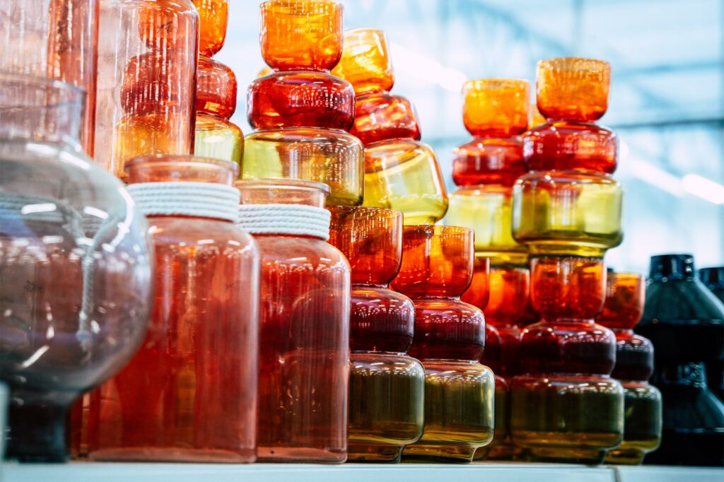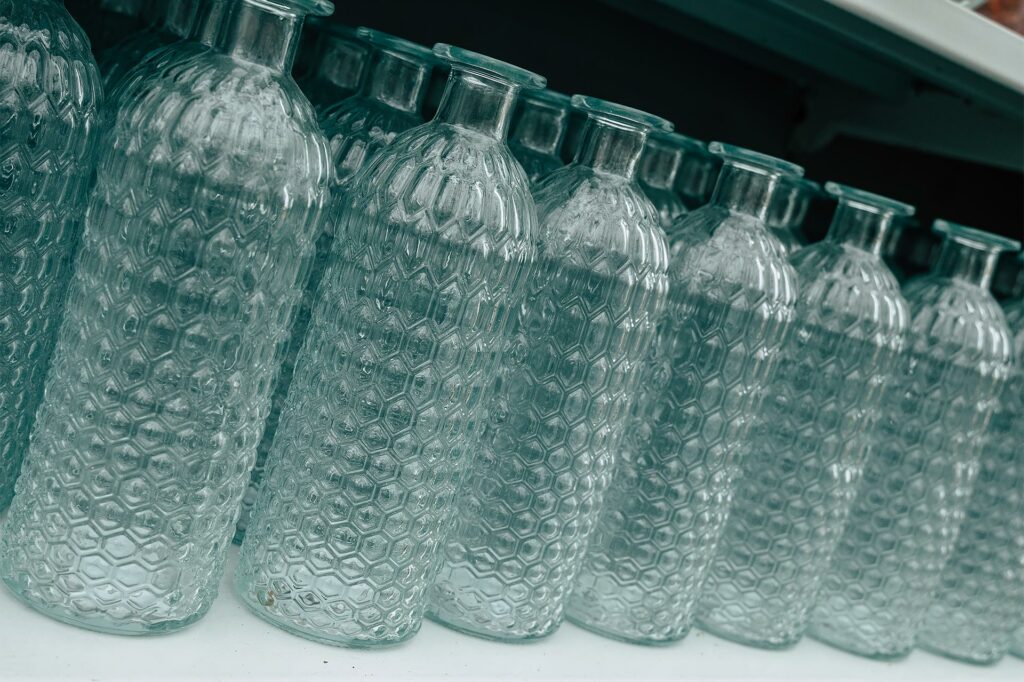 Diese geprägten Glasflaschen erinnern an Vintage-Designs und setzen klare Akzente im Regal.